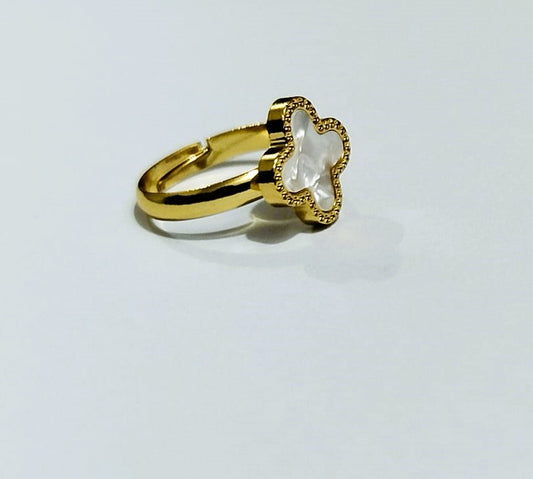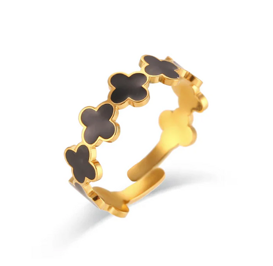 Adjustable Clover Ring – Golden with Black & White Stone | Stainless Steel