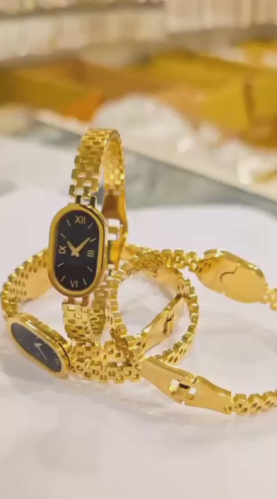 dd a touch of elegance to your everyday look with our Watch Style Bangle Bracelet. Crafted from high-quality stainless steel and finished in a stunning golden polish, this stylish accessory combines the charm of a bracelet with the sophistication of a watch design – minus the timepiece.