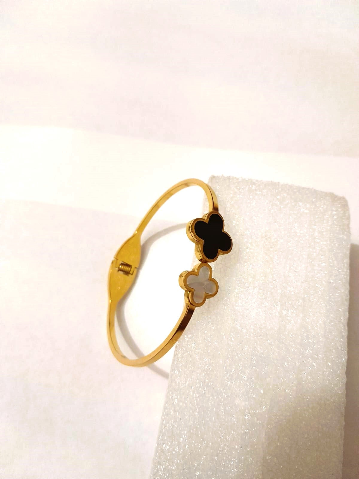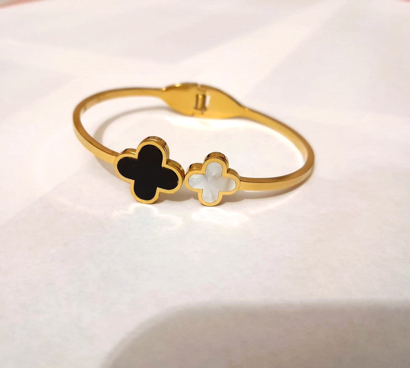 White & Black Clover Stainless Steel Open Cuff Bracelet - Fashionable Jewelry for Women & Girls